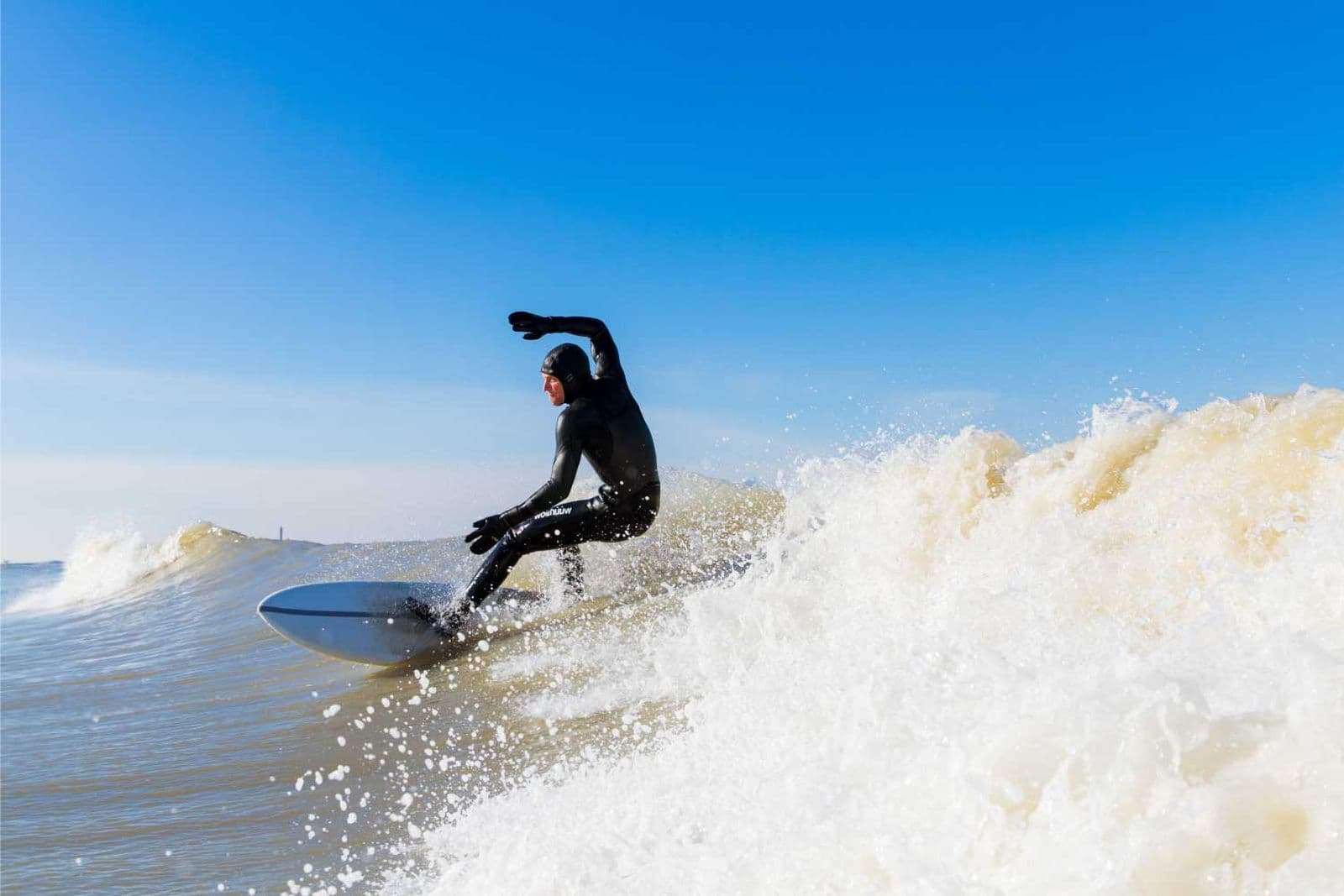 Scheveningen, of course! Deze kuststad is door de jaren heen zowat het walhalla van de Nederlandse surfscène geworden. Het is een van de bekendste surfspots in Nederland om te surfen in de Noordzee. Je vindt hier veel verschillende surfspots, maar de bekendste zijn ‘De Zuid’ en ‘De Noord’, respectievelijk aan het zuidelijk en noordelijk havenhoofd. Surfen in Scheveningen is zo populair dat je jezelf af en toe in Californië waant. Dit komt door de stabiele zandbanken te vinden bij de pier. Ook al wordt het drukker en drukker in Scheveningen, door het lange strand vind je makkelijk breaks voor jezelf en kan je lekker de Noordzee surfen.